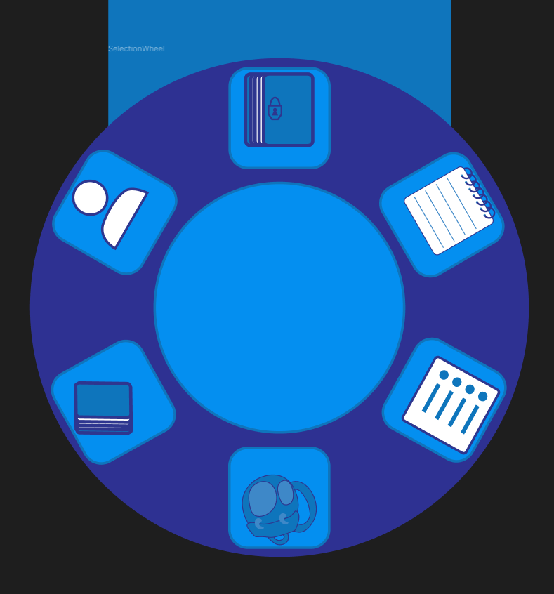 this was the first design for the menu at the bottom of the screen was a wheel which the user could turn in order to access other tabs with the central part of the circle being a button which would lead the user back to the home page. However this version was obnoxious to use if the user tried to use the app as intended, This prompted me to redesign this with a simpler version